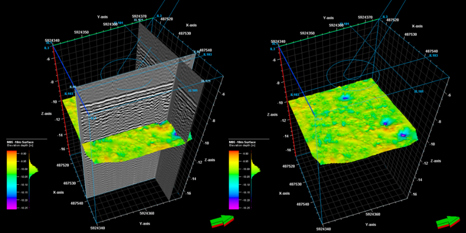High resolution 3D seismic volumes of the subsurface enabling unexploded ordnance detection, quantitative depth of burial assessments and detailed ground modelling.